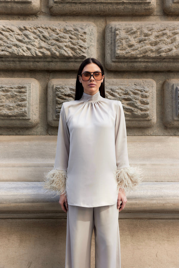 Elevated, elegant, and designed to stand out — the Beige Twinset is a refined two-piece ensemble crafted for the woman who embodies both strength and grace. The structured blouse features a statement collar, shoulder padding for a defined silhouette, and subtle side slits for added movement. Feather-trimmed sleeves complete the look with a luxurious touch.