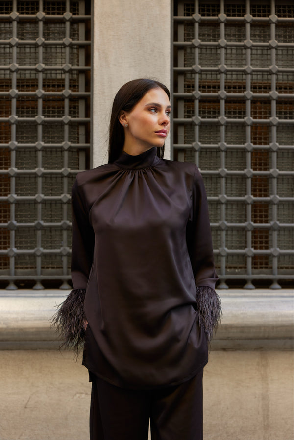 Elevated, elegant, and designed to stand out — the Dark Brown Set is a refined two-piece ensemble crafted for the woman who embodies both strength and grace. The structured blouse features a statement collar, shoulder padding for a defined silhouette, and subtle side slits for added movement. Feather-trimmed sleeves complete the look with a luxurious touch.